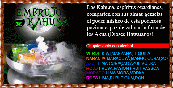 Embrujo De Kahuna 6 octubre, 2025 No Comments SOLO CON ALCOHOLINDIVIDUAL 11 €6 CHUPITOS PARA CONPARTIR