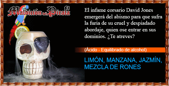 Maldición Del Pirata 6 octubre, 2025 No Comments SIN ALCOHOLINDIVIDUAL7,5 € - MEDIANO 12 € - GRANDE 22 €CON ALCOHOLINDIVIDUAL 9,5 € - MEDIANO 16 € - GRANDE 30 €